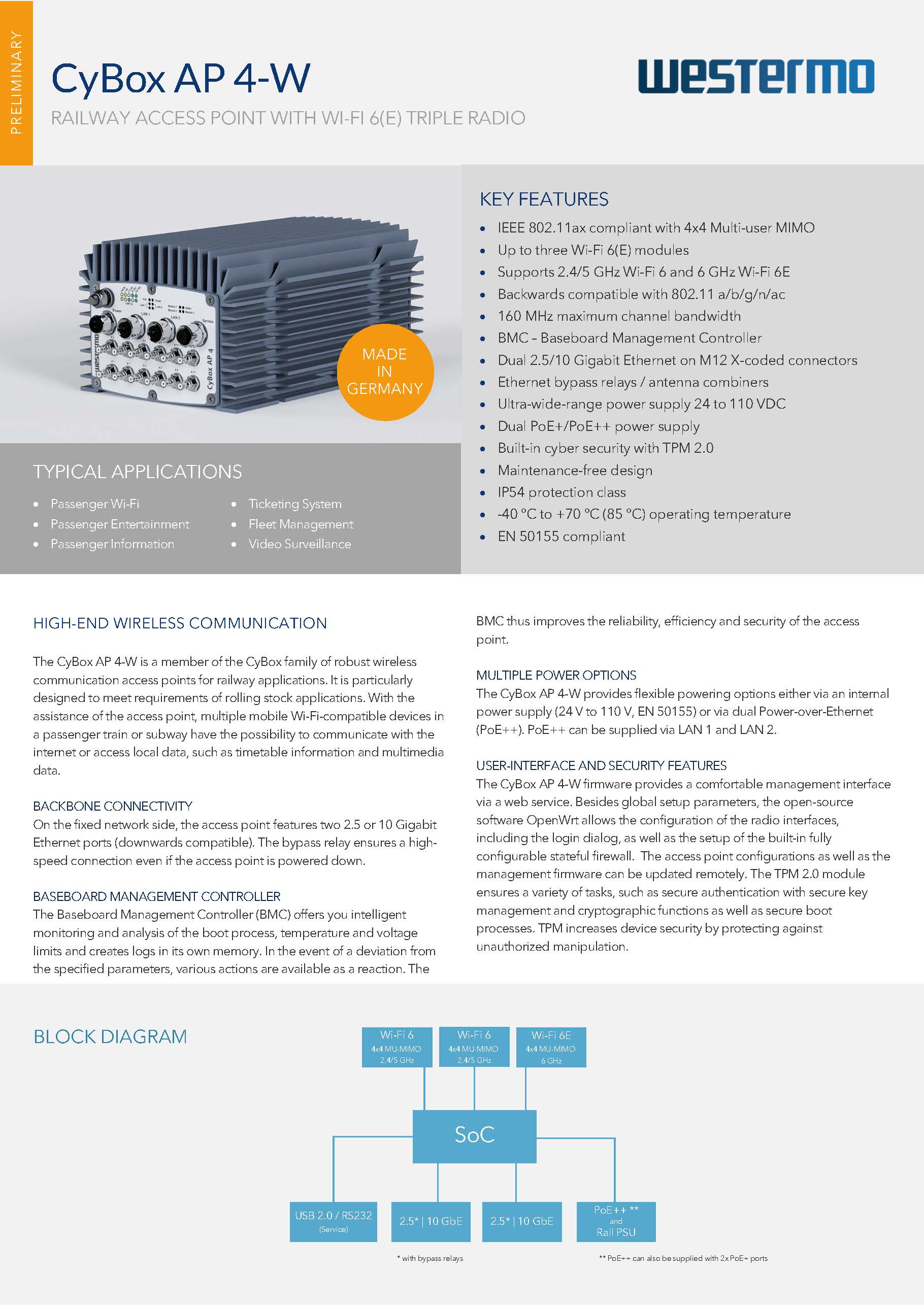 Der Access Point ist designt nach dem internationalen Standard EN 50155. Bauteile müssen für den Einsatz in mobilen Anwendungen den strengsten Umweltanforderungen, wie z.B. einem erweiterten Temperaturbereich, entsprechen. Darüber hinaus müssen sie widerstandsfähig gegen Stöße, Erschütterungen und Vibrationen sein.